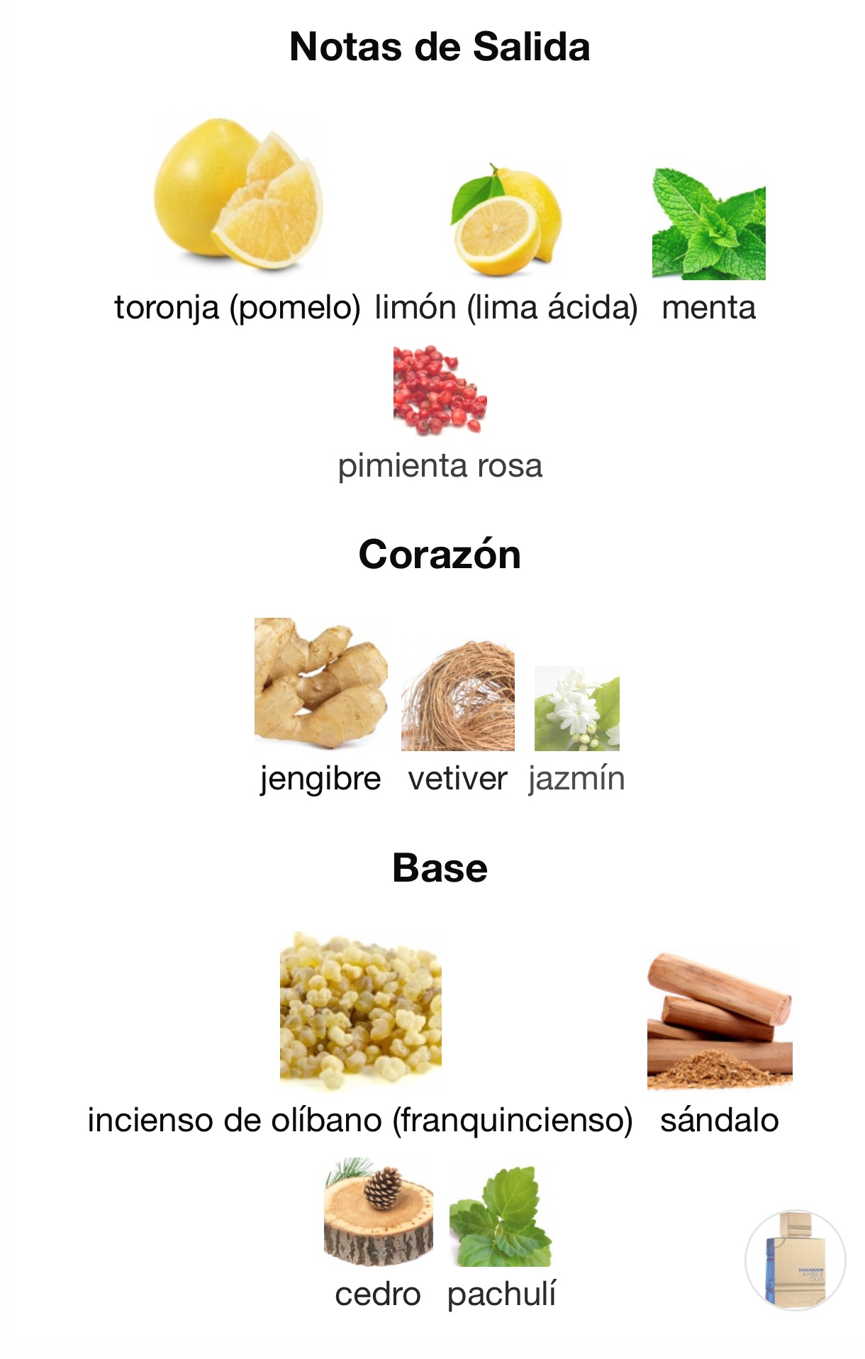 Las Notas de Salida son toronja (pomelo), limón (lima ácida), menta y pimienta rosa; las Notas de Corazón son jengibre, vetiver y jazmín; las Notas de Fondo son incienso de olíbano (franquincienso), sándalo, cedro y pachulí.
