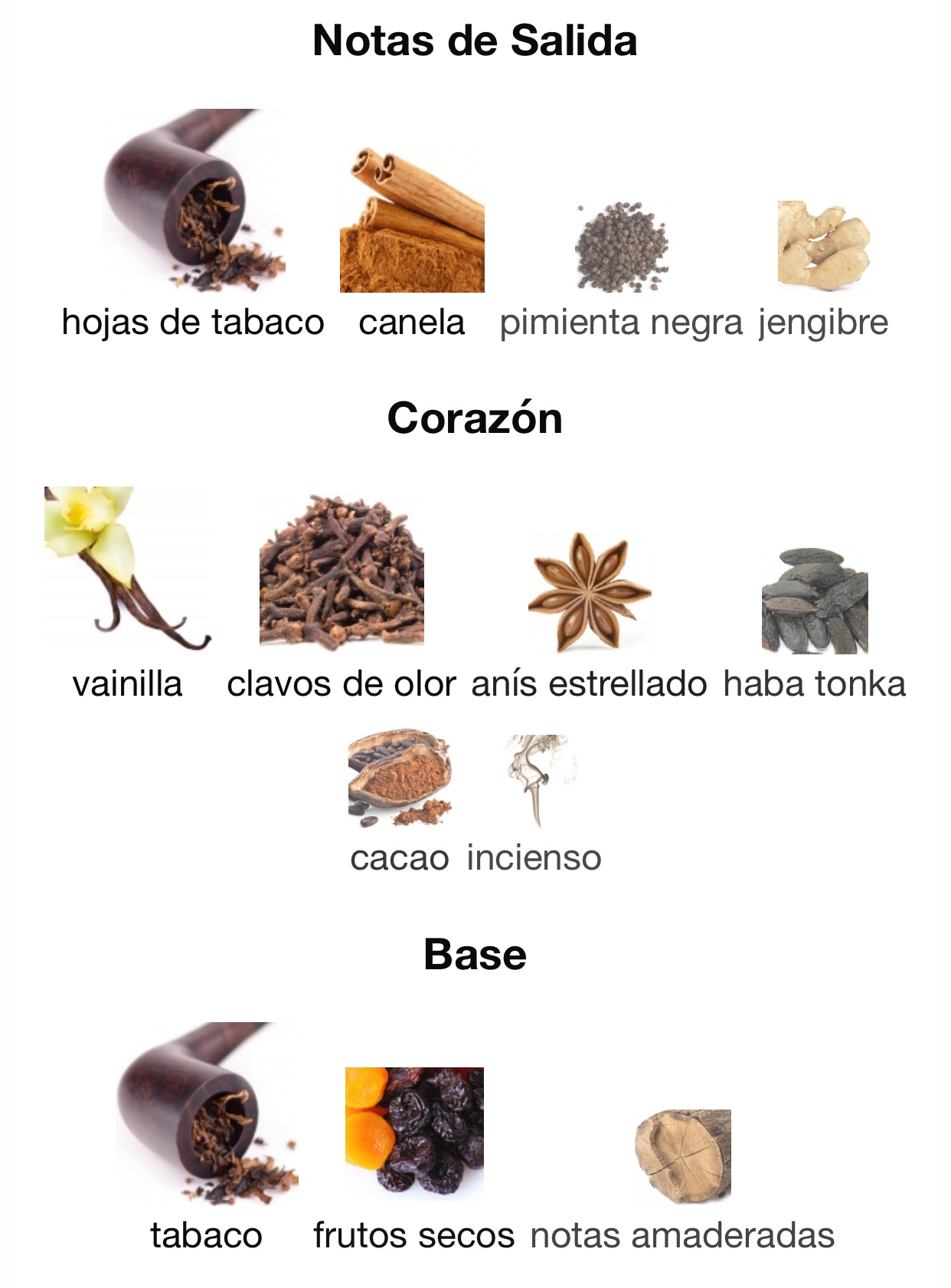 Las Notas de Salida son hojas de tabaco, canela, pimienta negra y jengibre; las Notas de Corazón son vainilla, clavos de olor, anís estrellado, haba tonka, cacao y incienso; las Notas de Fondo son tabaco, frutos secos y notas amaderadas.