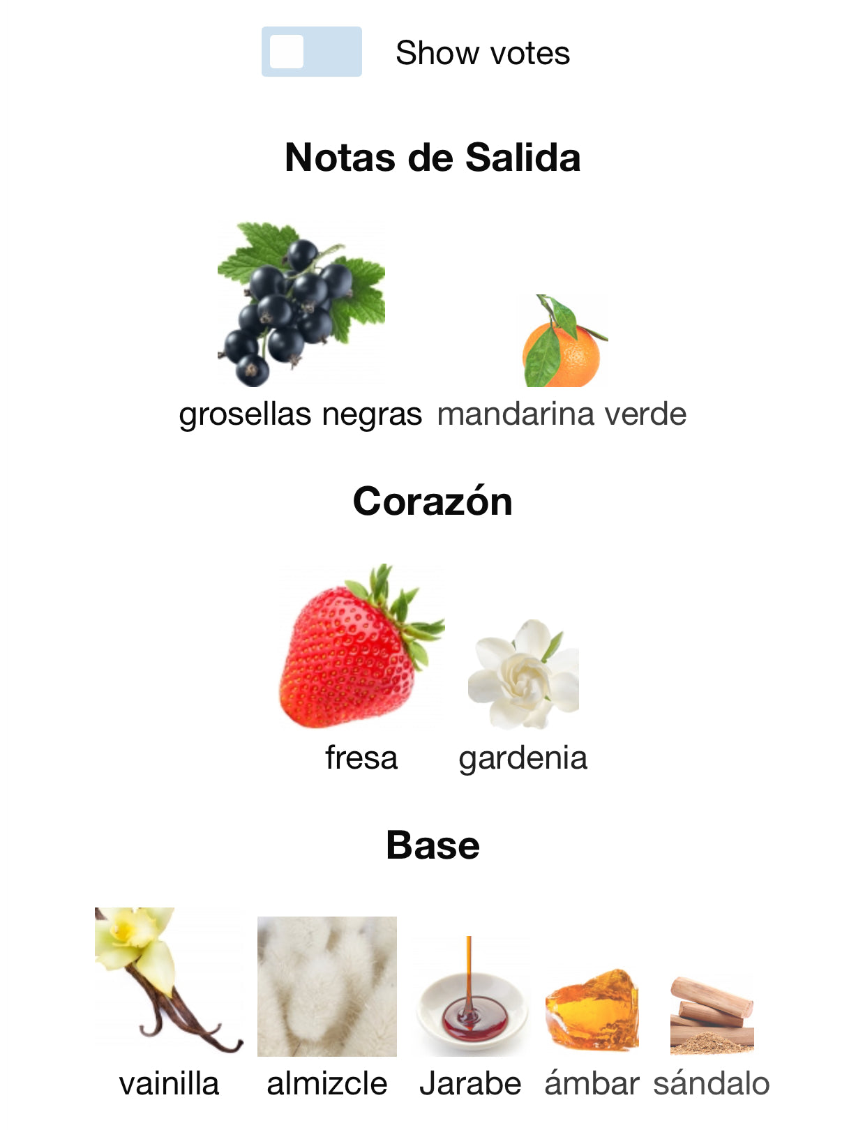 Las Notas de Salida son grosellas negras y mandarina verde; las Notas de Corazón son fresa y gardenia; las Notas de Fondo son vainilla, almizcle, Jarabe, ámbar y sándalo.