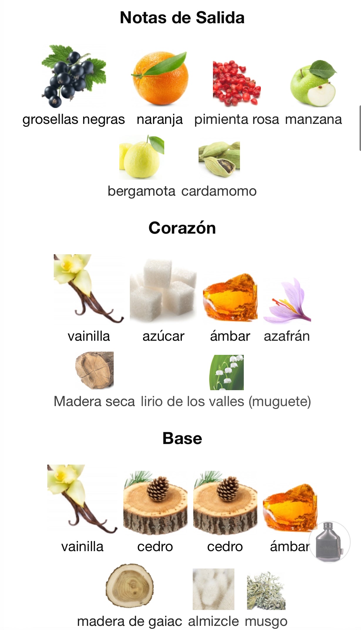 Las Notas de Salida son grosellas negras, naranja, pimienta rosa, manzana, bergamota y cardamomo; las Notas de Corazón son vainilla, azúcar, ámbar, azafrán, Madera seca y lirio de los valles (muguete); las Notas de Fondo son vainilla, cedro, cedro, ámbar, madera de gaiac, almizcle y musgo.