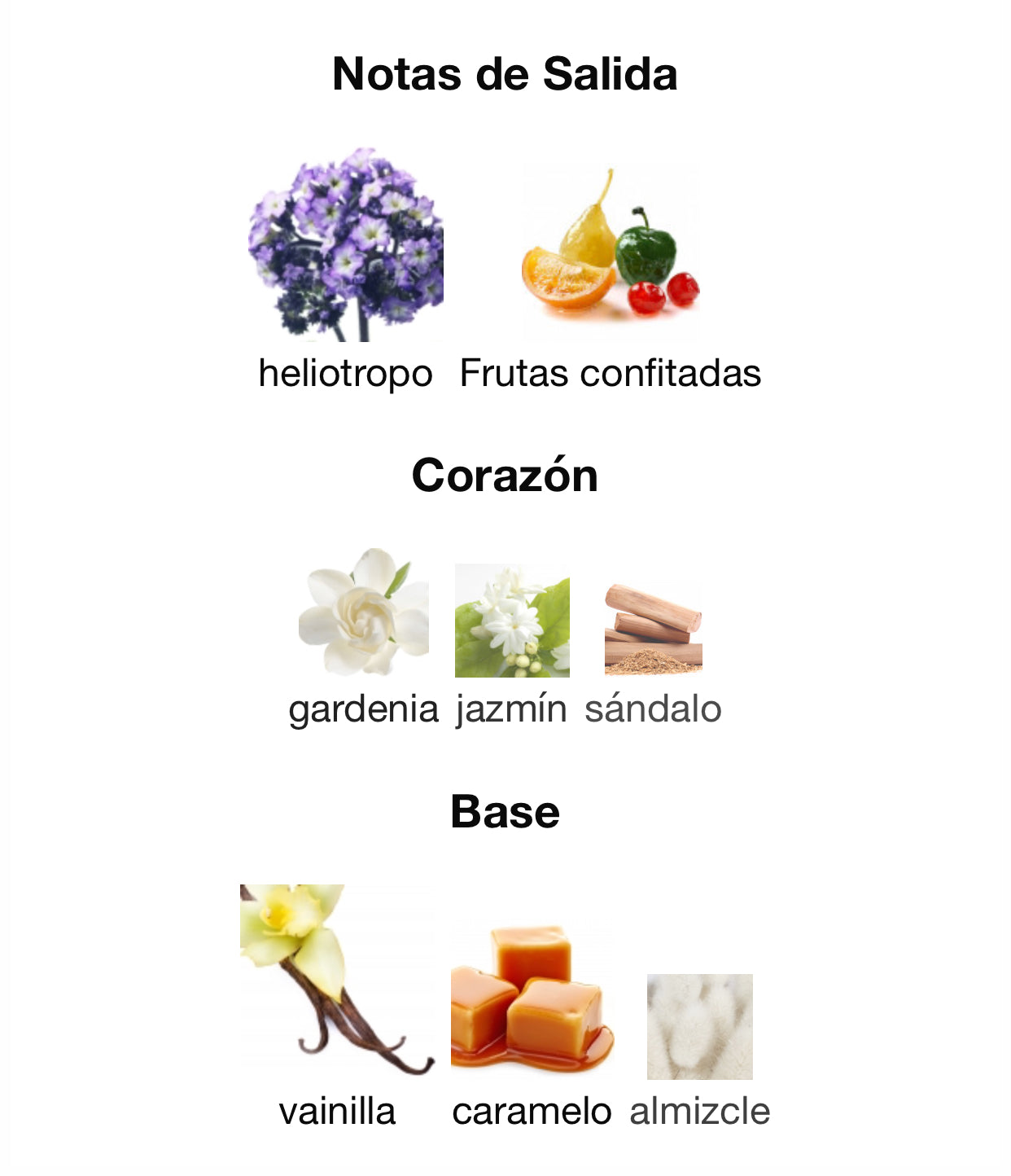 Las Notas de Salida son heliotropo y Frutas confitadas; las Notas de Corazón son gardenia, jazmín y sándalo; las Notas de Fondo son vainilla, caramelo y almizcle.