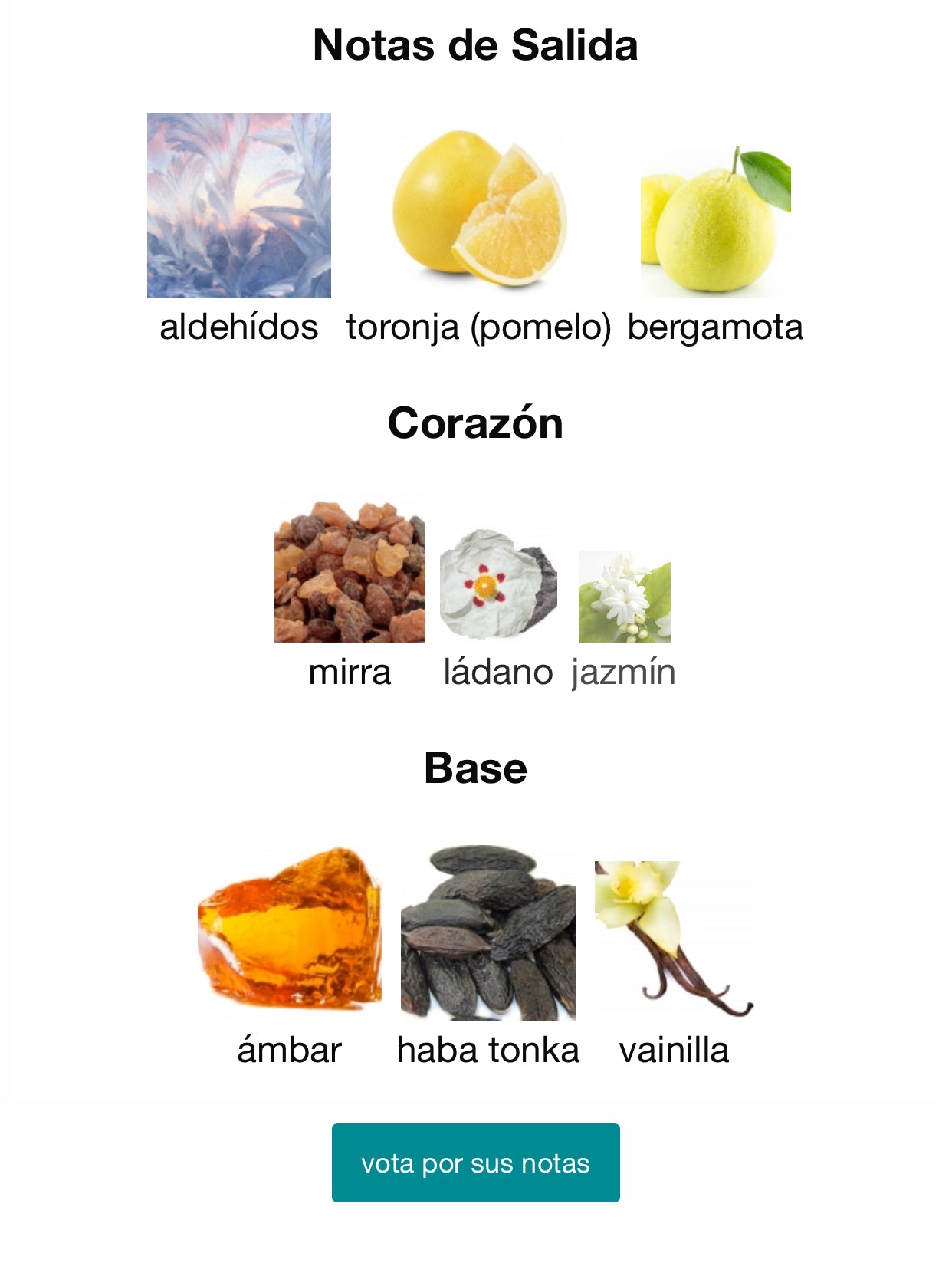 Las Notas de Salida son aldehídos, toronja (pomelo) y bergamota; las Notas de Corazón son mirra, ládano y jazmín; las Notas de Fondo son ámbar, haba tonka y vainilla.