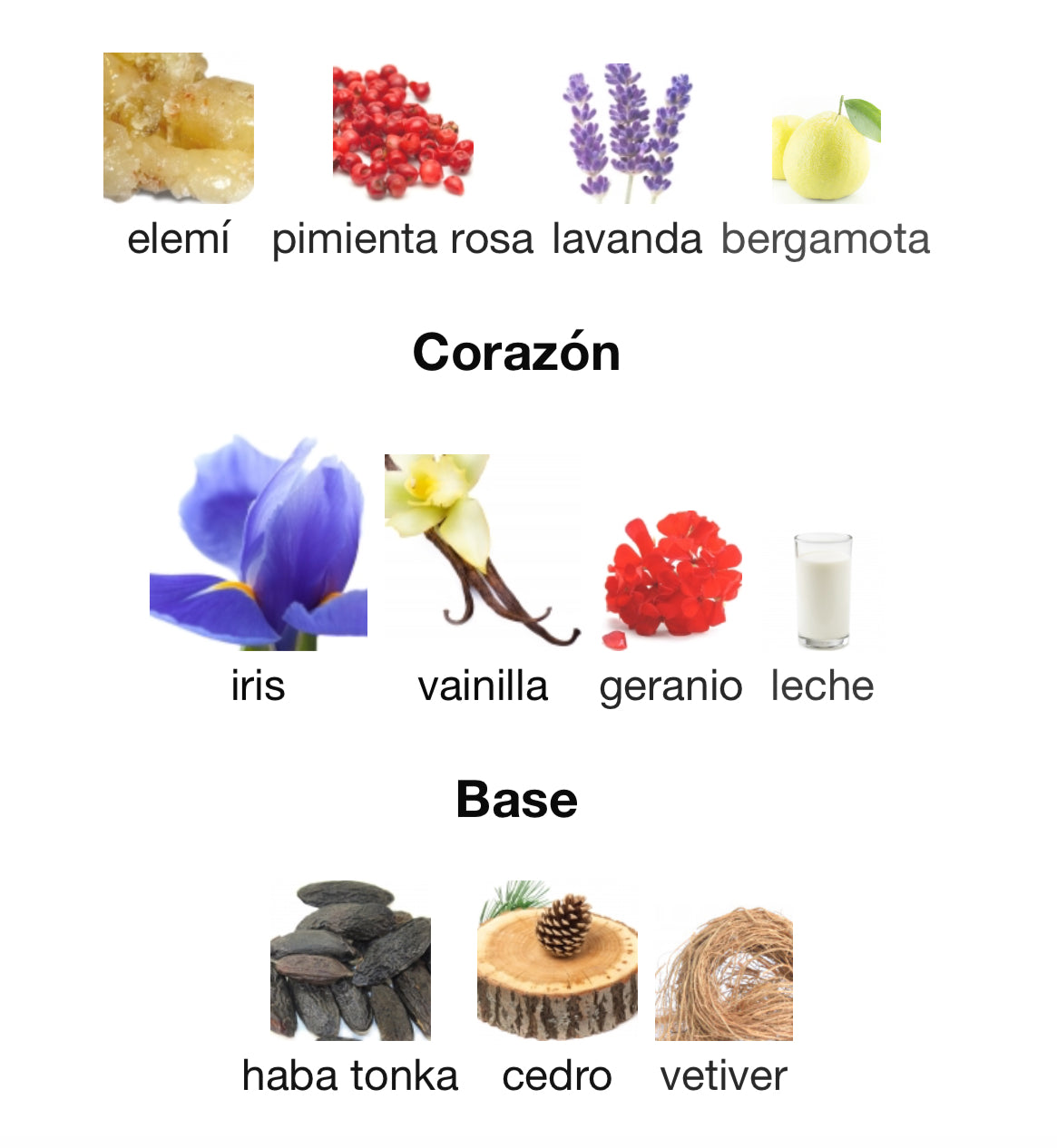 Las Notas de Salida son elemí, pimienta rosa, lavanda y bergamota; las Notas de Corazón son iris, vainilla, geranio y leche; las Notas de Fondo son haba tonka, cedro y vetiver.
