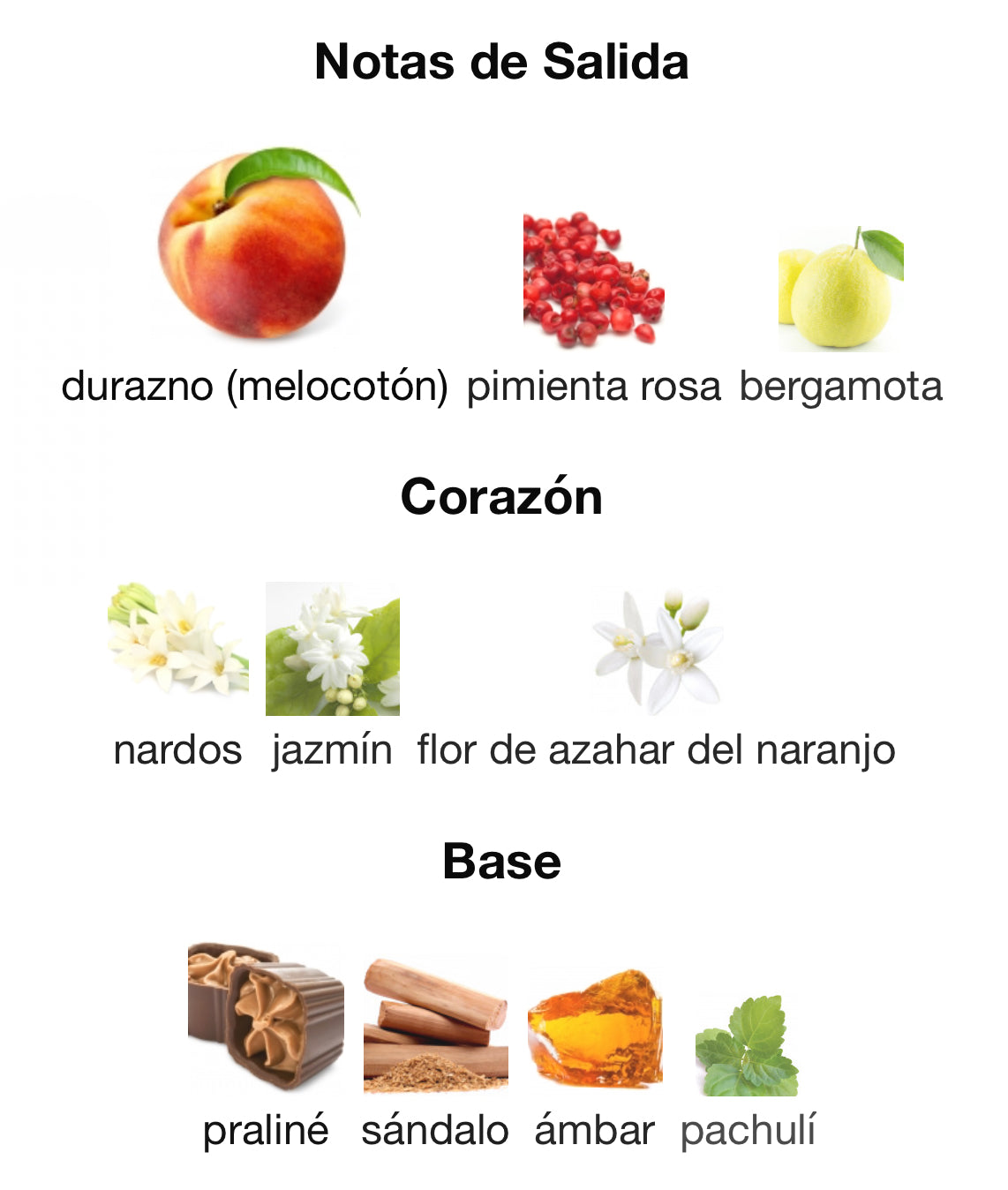 Las Notas de Salida son durazno (melocotón), pimienta rosa y bergamota; las Notas de Corazón son nardos, jazmín y flor de azahar del naranjo; las Notas de Fondo son praliné, sándalo, ámbar y pachulí.