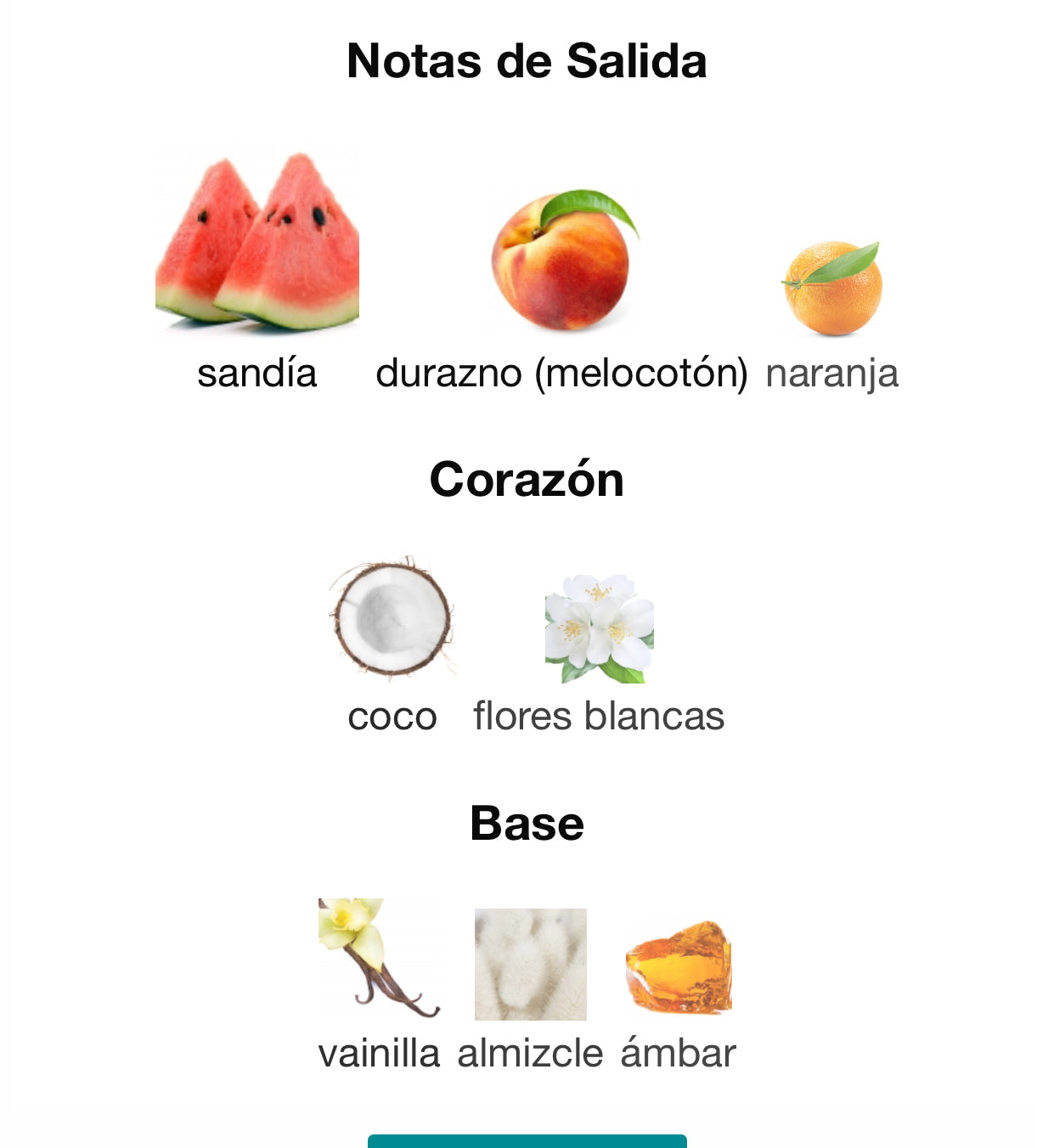 Las Notas de Salida son sandía, durazno (melocotón) y naranja; las Notas de Corazón son coco y flores blancas; las Notas de Fondo son vainilla, almizcle y ámbar.
