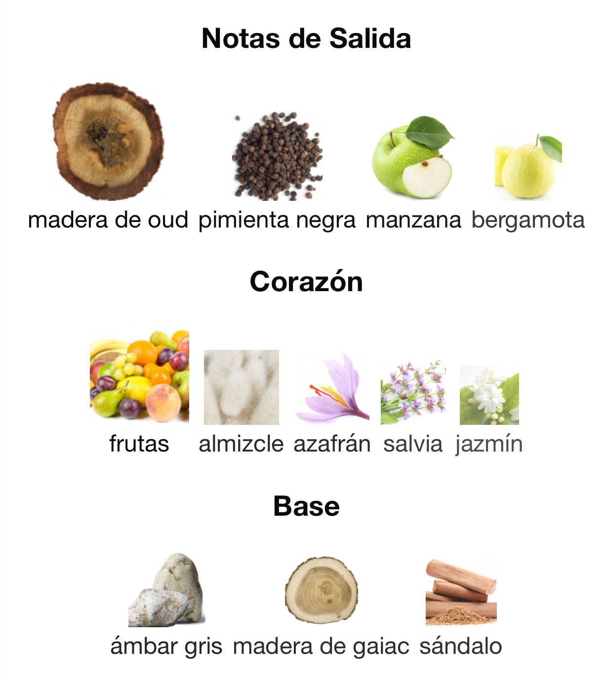 Las Notas de Salida son madera de oud, pimienta negra, manzana y bergamota; las Notas de Corazón son frutas, almizcle, azafrán, salvia y jazmín; las Notas de Fondo son ámbar gris, madera de gaiac y sándalo.