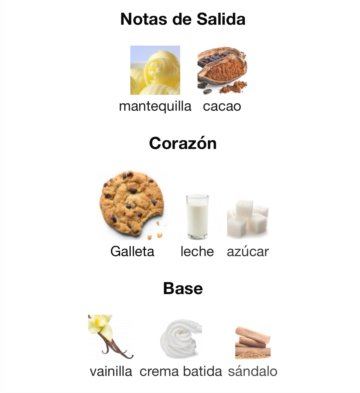 Las Notas de Salida son mantequilla y cacao; las Notas de Corazón son Galleta, leche y azúcar; las Notas de Fondo son vainilla, crema batida y sándalo.