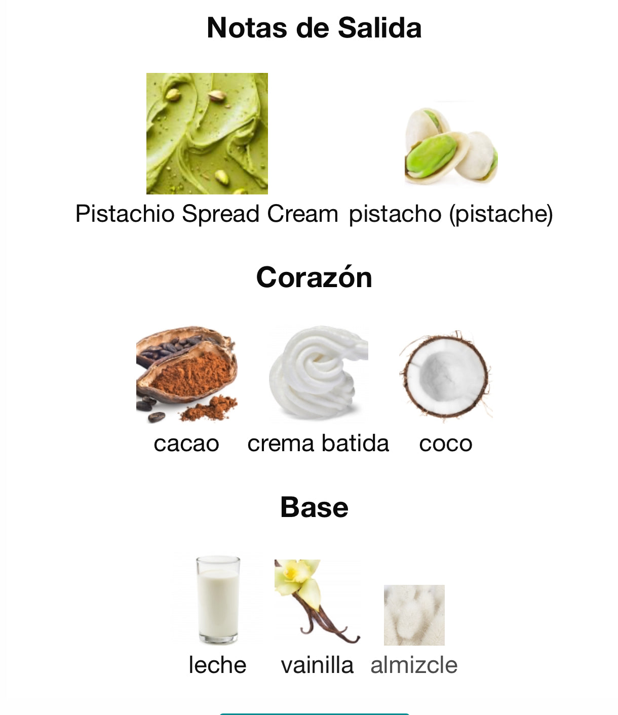Las Notas de Salida son Pistachio Spread Cream y pistacho (pistache); las Notas de Corazón son cacao, crema batida y coco; las Notas de Fondo son leche, vainilla y almizcle.