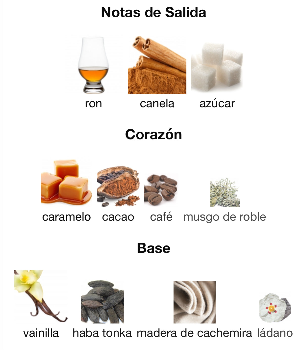 Las Notas de Salida son ron, canela y azúcar; las Notas de Corazón son caramelo, cacao, café y musgo de roble; las Notas de Fondo son vainilla, haba tonka, madera de cachemira y ládano.