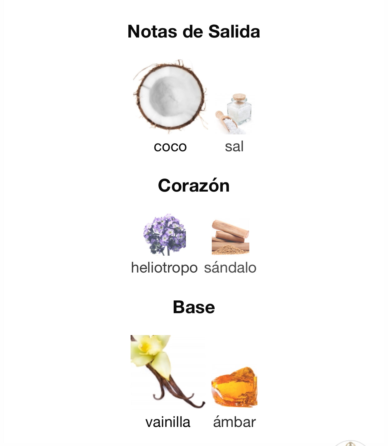 Las Notas de Salida son coco y sal; las Notas de Corazón son heliotropo y sándalo; las Notas de Fondo son vainilla y ámbar.