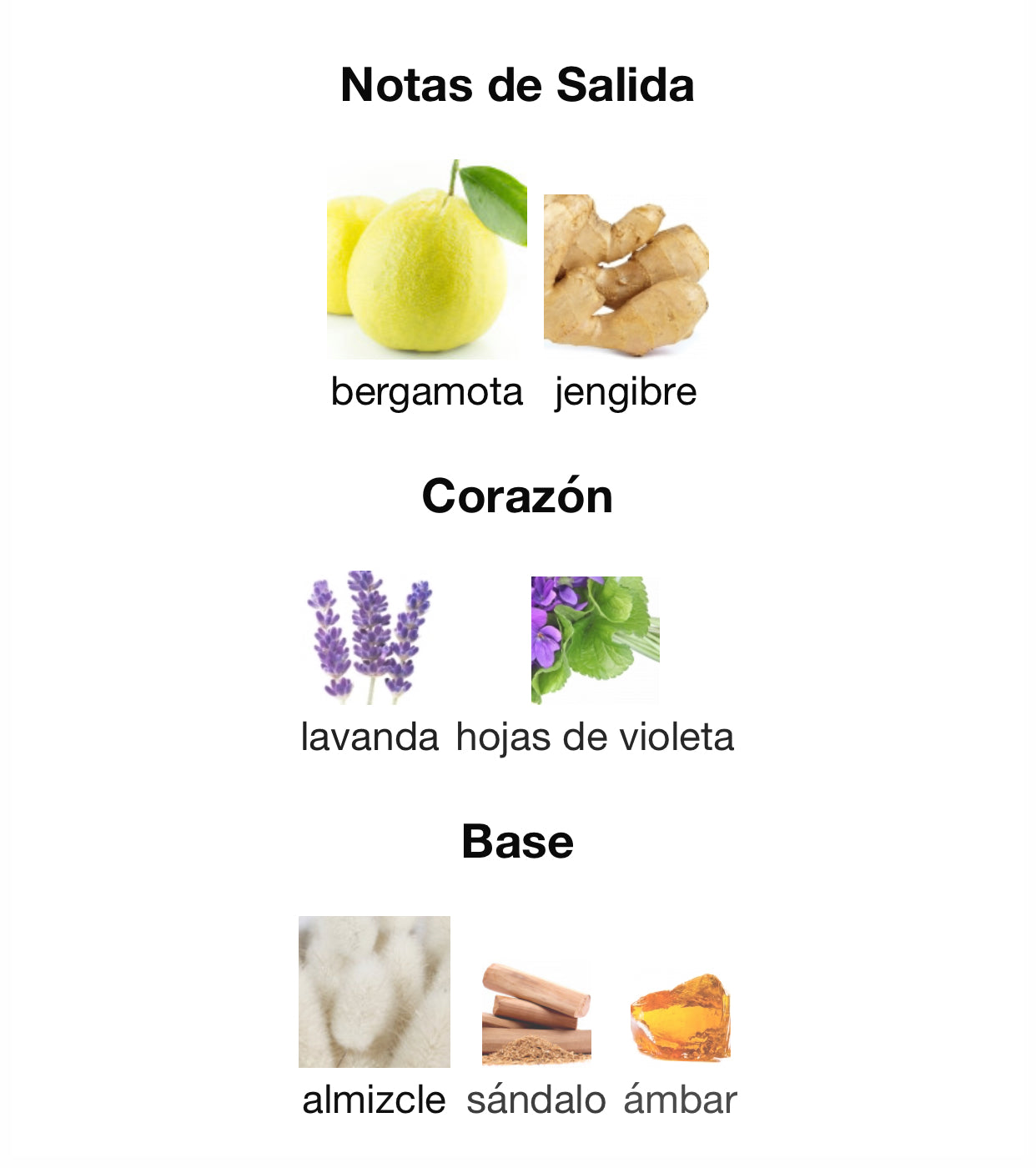 Las Notas de Salida son bergamota y jengibre; las Notas de Corazón son lavanda y hojas de violeta; las Notas de Fondo son almizcle, sándalo y ámbar.