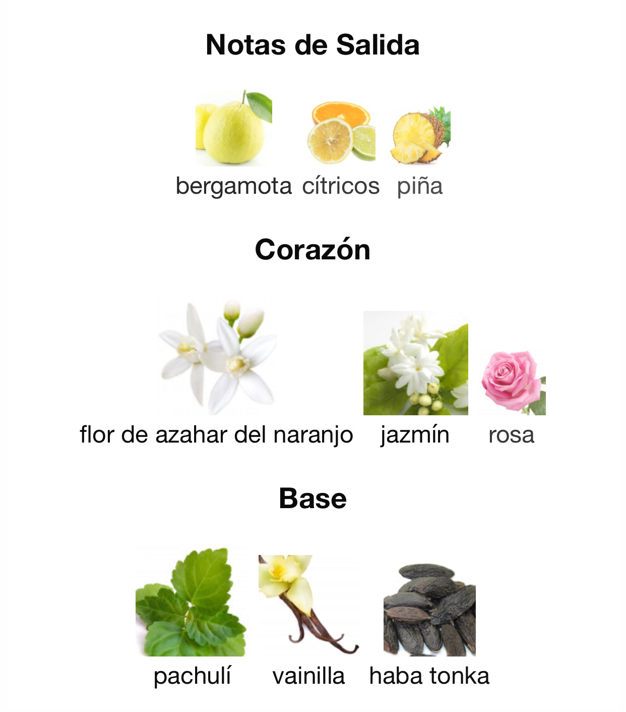 Las Notas de Salida son bergamota, cítricos y piña; las Notas de Corazón son flor de azahar del naranjo, jazmín y rosa; las Notas de Fondo son pachulí, vainilla y haba tonka.