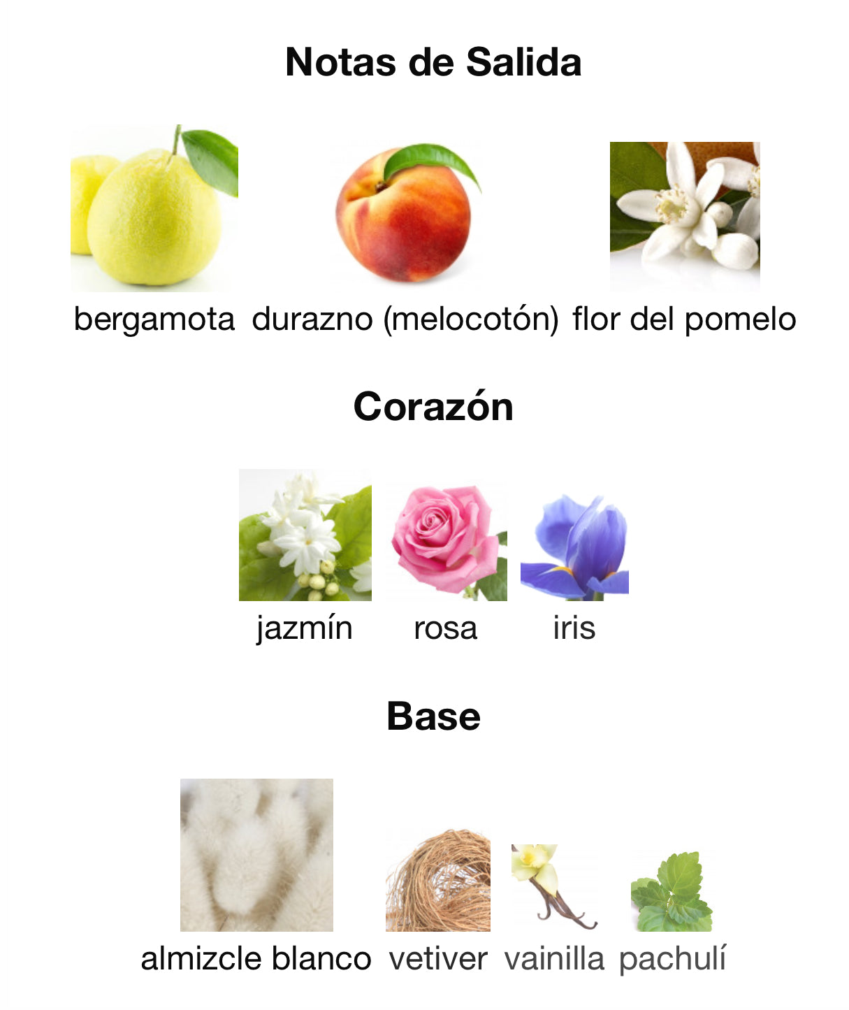 Las Notas de Salida son bergamota, durazno (melocotón) y flor del pomelo; las Notas de Corazón son jazmín, rosa y iris; las Notas de Fondo son almizcle blanco, vetiver, vainilla y pachulí.