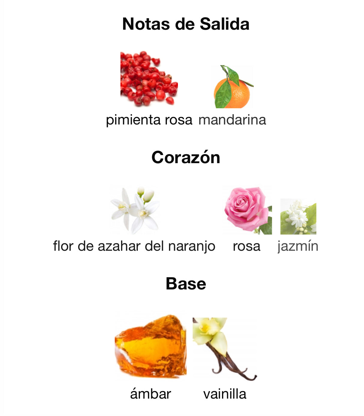 Las Notas de Salida son pimienta rosa y mandarina; las Notas de Corazón son flor de azahar del naranjo, rosa y jazmín; las Notas de Fondo son ámbar y vainilla.