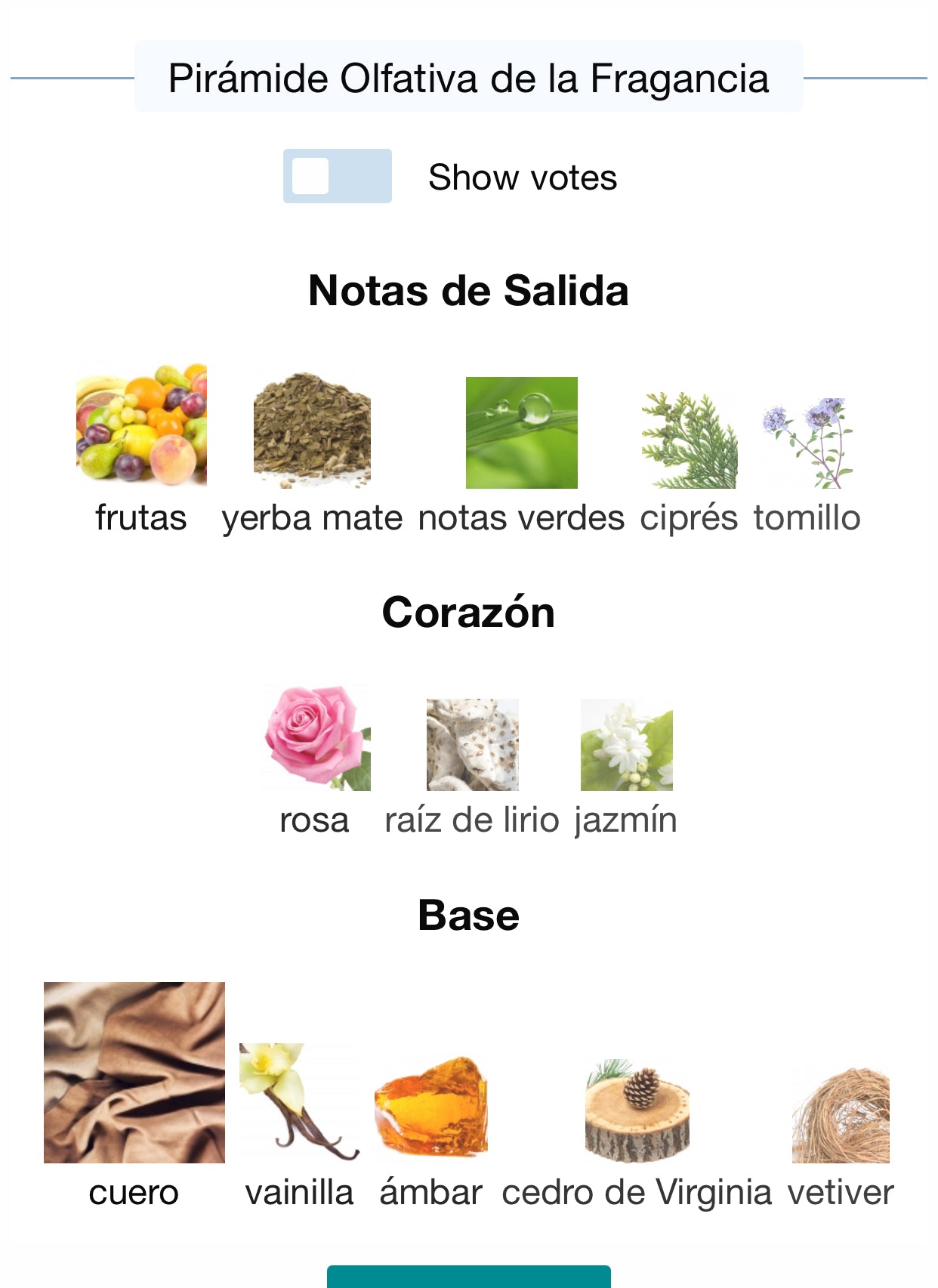 Las Notas de Salida son frutas, yerba mate, notas verdes, ciprés y tomillo; las Notas de Corazón son rosa, raíz de lirio y jazmín; las Notas de Fondo son cuero, vainilla, ámbar, cedro de Virginia y vetiver.