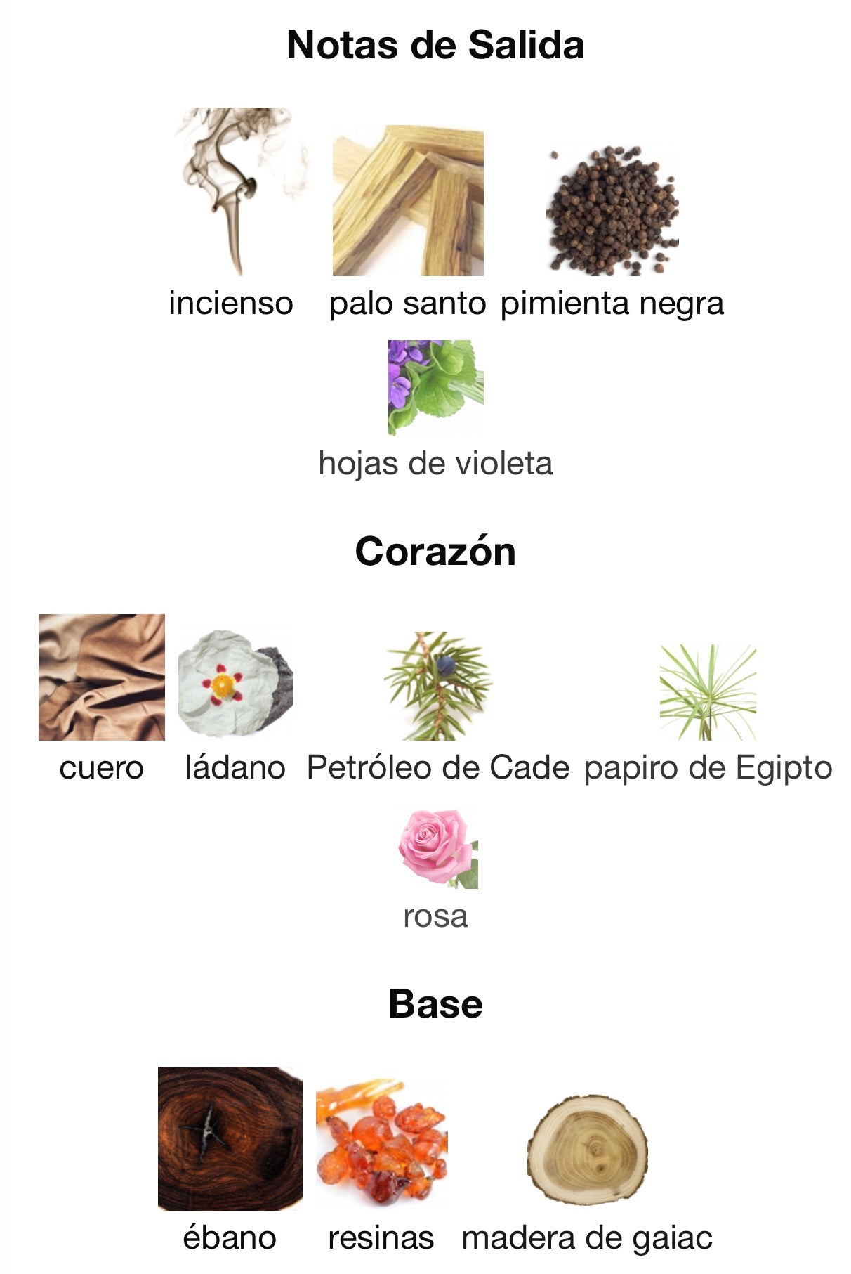 Las Notas de Salida son incienso, palo santo, pimienta negra y hojas de violeta; las Notas de Corazón son cuero, ládano, Petróleo de Cade, papiro de Egipto y rosa; las Notas de Fondo son ébano, resinas y madera de gaiac.