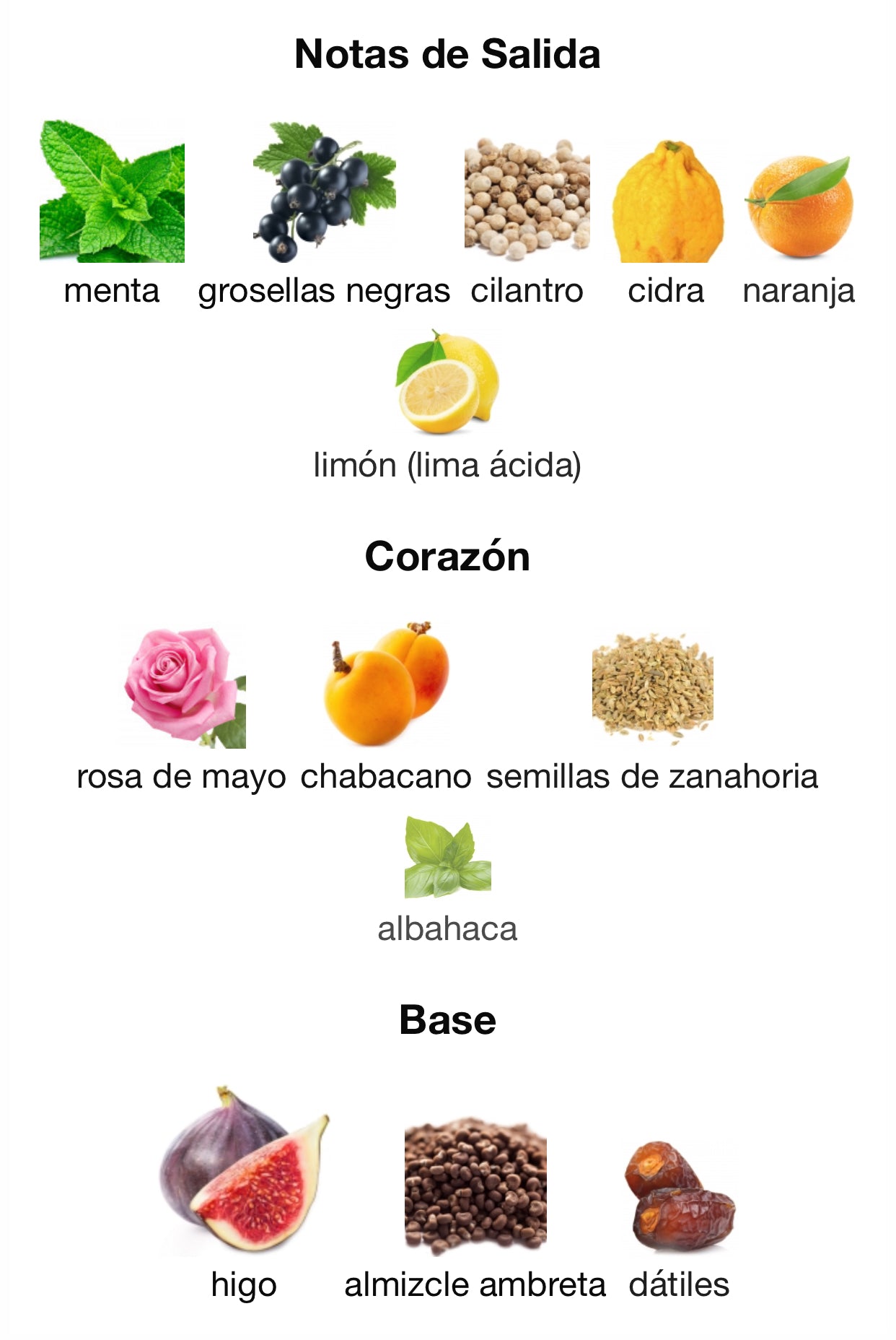 Las Notas de Salida son menta, grosellas negras, cilantro, cidra, naranja y limón (lima ácida); las Notas de Corazón son rosa de mayo, chabacano, semillas de zanahoria y albahaca; las Notas de Fondo son higo, almizcle ambreta y dátiles.