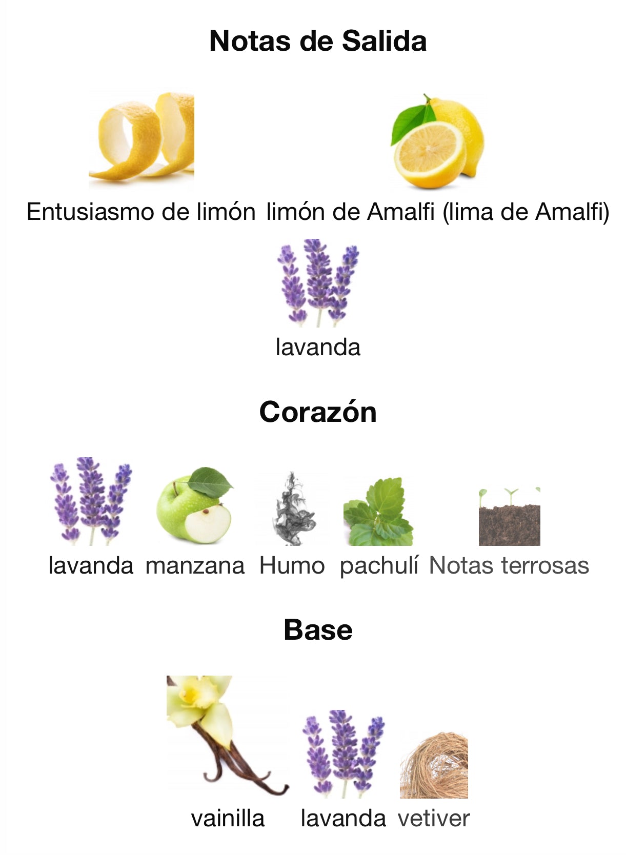 Las Notas de Salida son Entusiasmo de limón, limón de Amalfi (lima de Amalfi) y lavanda; las Notas de Corazón son lavanda, manzana, Humo, pachulí y Notas terrosas; las Notas de Fondo son vainilla, lavanda y vetiver.