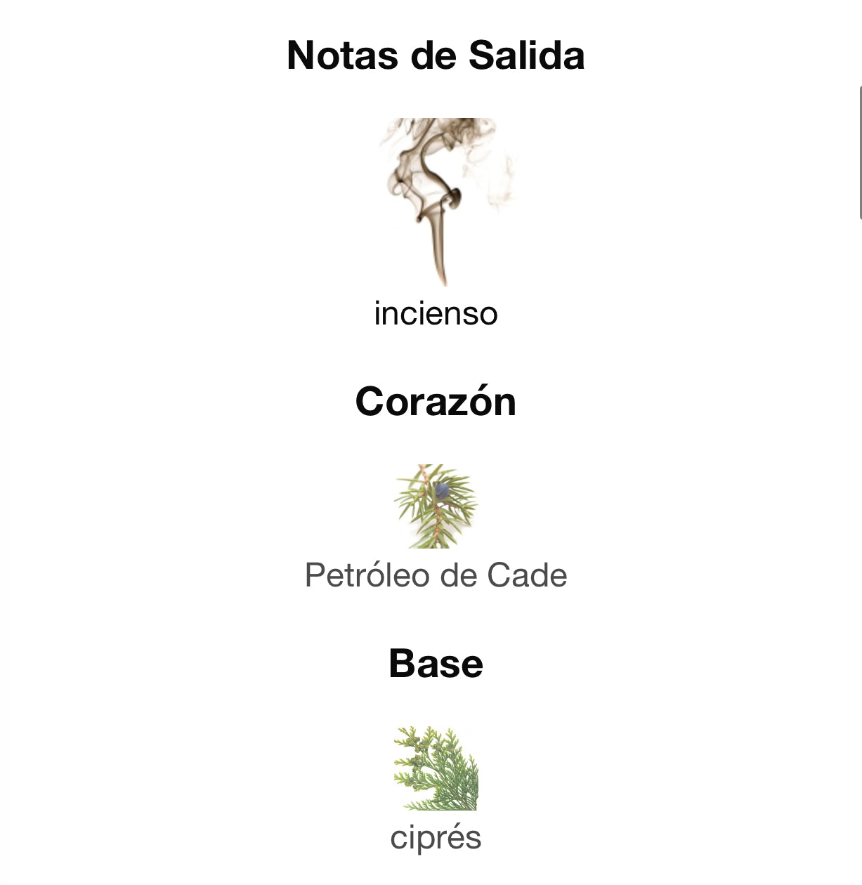 La Nota de Salida es incienso; la Nota de Corazón es Petróleo de Cade; la Nota de Fondo es ciprés.
