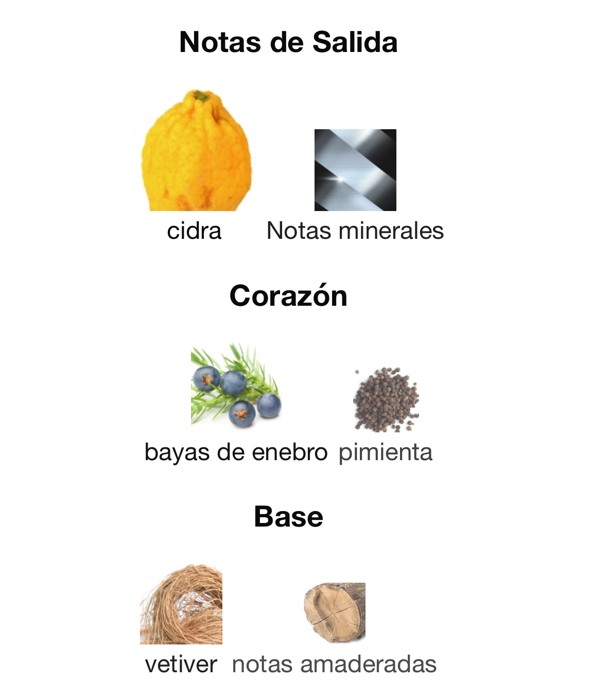Las Notas de Salida son cidra y Notas minerales; las Notas de Corazón son bayas de enebro y pimienta; las Notas de Fondo son vetiver y notas amaderadas.