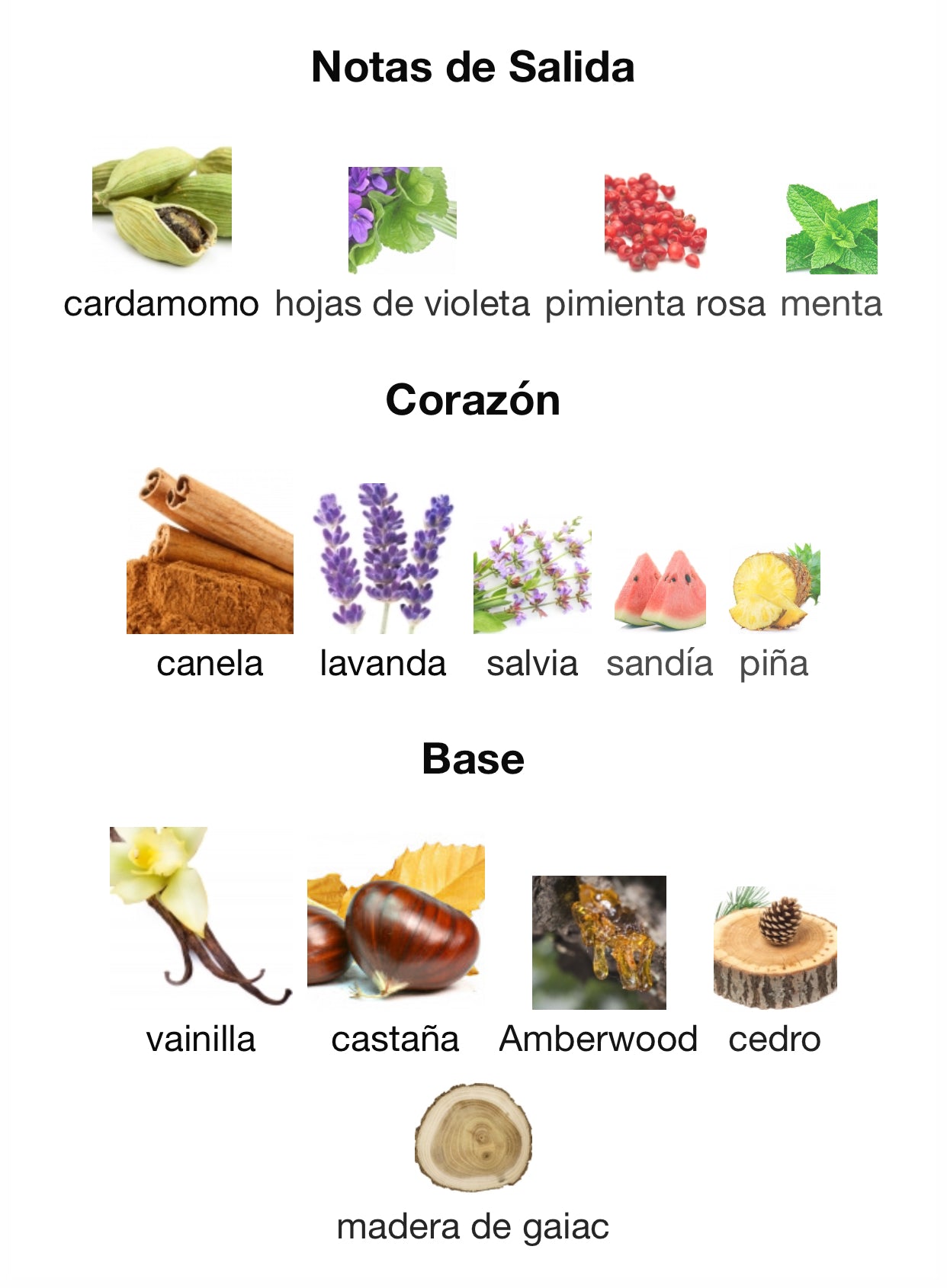Las Notas de Salida son cardamomo, hojas de violeta, pimienta rosa y menta; las Notas de Corazón son canela, lavanda, salvia, sandía y piña; las Notas de Fondo son vainilla, castaña, Amberwood, cedro y madera de gaiac.