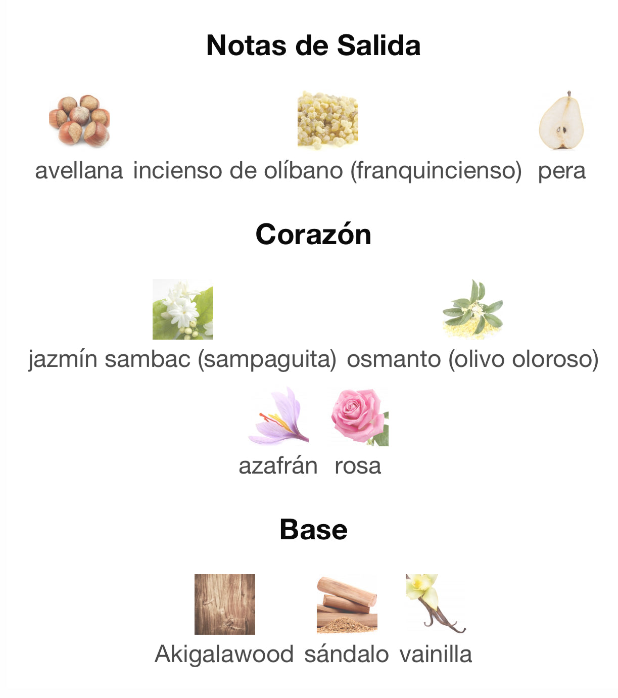 Las Notas de Salida son avellana, incienso de olíbano (franquincienso) y pera; las Notas de Corazón son jazmín sambac (sampaguita), osmanto (olivo oloroso), azafrán y rosa; las Notas de Fondo son Akigalawood, sándalo y vainilla.