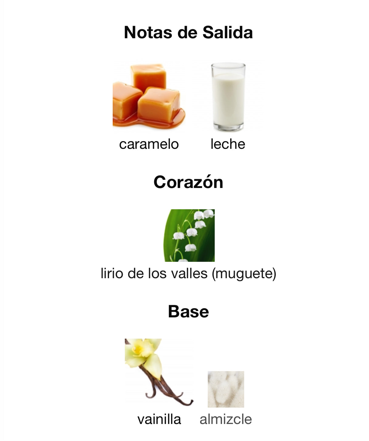 Las Notas de Salida son caramelo y leche; la Nota de Corazón es lirio de los valles (muguete); las Notas de Fondo son vainilla y almizcle.